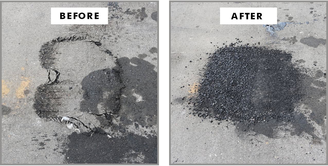 Above is an example of a small test patch of pavement that had dipped from a transport truck tire. Once all six infrared tubes were switched on (360,000 BTU), the asphalt was almost to original mixing temperature within 3-4 minutes and ready to be raked and tampered. (*heat up time may vary depending on ambient temperatures).